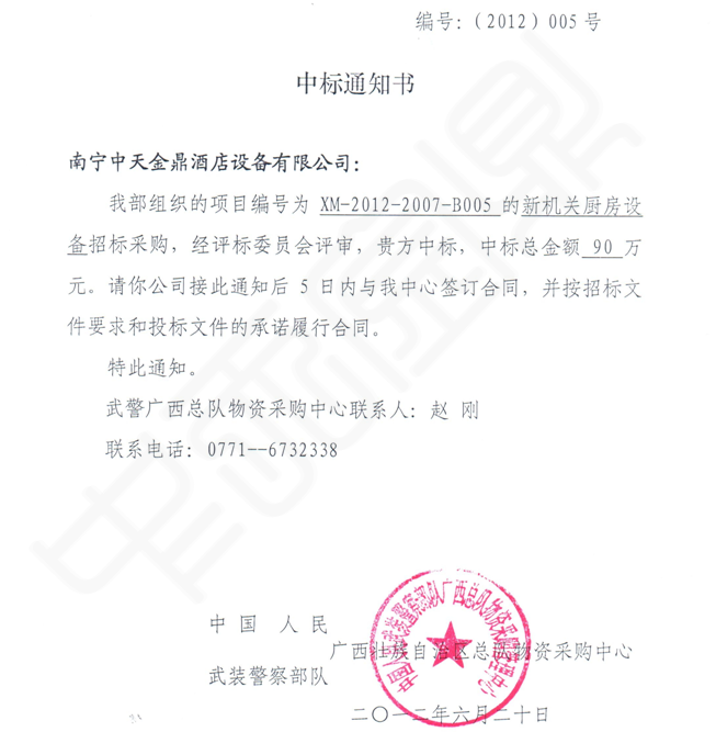 廣西人民武警總部---新機關廚房設備(項目中標)